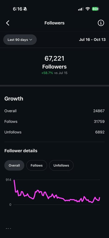 Current (Oct. 14, 2025) - 8 month brand transformation. 67k follower milestone.