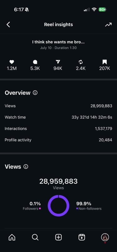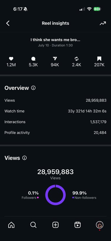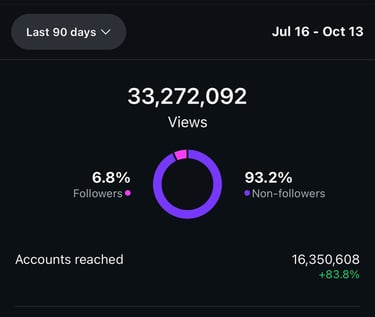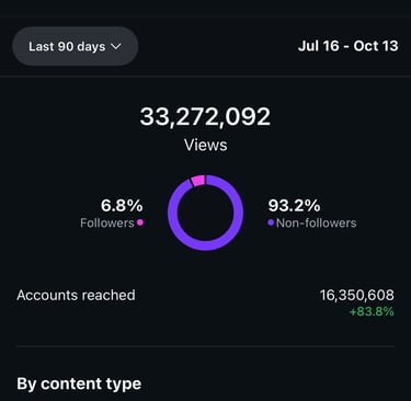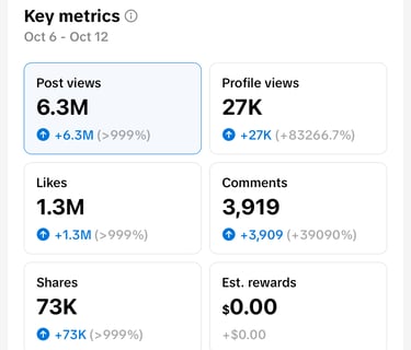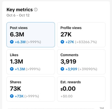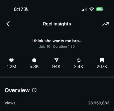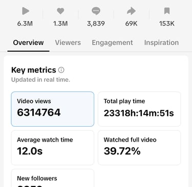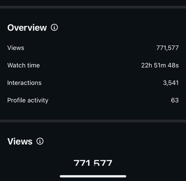 Below is a collection of video analytics and performance insights showcasing the proven results of my content strategies across multiple platforms. Each example highlights measurable growth, engagement, and reach achieved through my creative and data-driven approach. Below is showcasing some of my top content. I have hundreds of multi-hundred thousand view videos available for viewing on my socials on top of these.