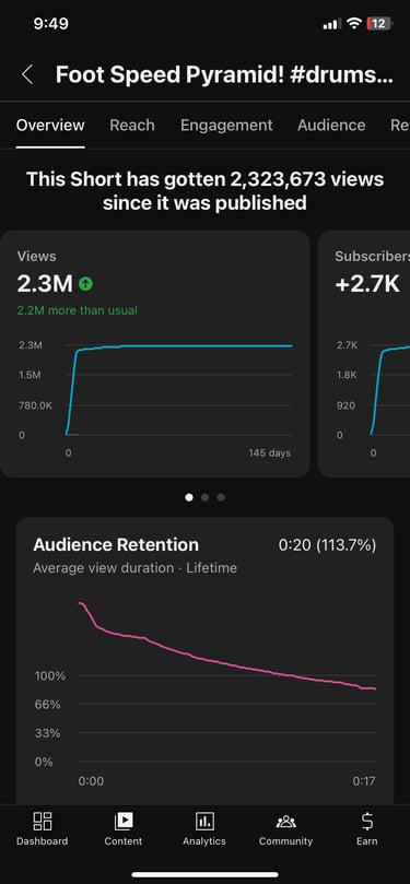 Over the past year, I’ve grown my online brand from zero to over 200,000 followers across Instagram, YouTube, and TikTok by developing a consistent, high-performing content strategy. Through storytelling, trend analysis, and a deep understanding of audience psychology, I built a loyal community around drumming, music education, and creative growth. My transformation reflects not only content creation skills but also expertise in brand building, engagement optimization, and social media growth strategy. I not only have done this for my own personal brand, but for clients as well.